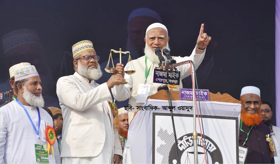 জনসভায় মঞ্চে বগুড়া-৫ (শেরপুর-ধুনট) আসনের জোটের প্রার্থী মাওলানা দবিবুর রহমানের হাতে দাঁড়িপাল্লা প্র্রতীক তুলে দিয়ে পরিচয় করিয়ে দাঁড়িপাল্লা মার্কায় ভোট দিয়ে বিজয়ী করার আহবান জানান।
