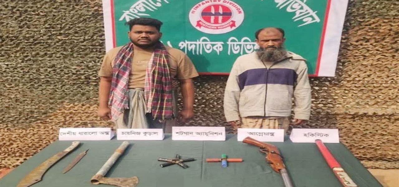 বগুড়া জেলার শেরপুর উপজেলার টাউন কলোনি এলাকায় সোমবার (৯ ফেব্রুয়ারি) ভোররাতে গোয়েন্দা তথ্যের ভিত্তিতে সেনাবাহিনীর নেতৃত্বে পরিচালিত যৌথ অভিযানে ১টি শর্টগান, ৯ রাউন্ড গুলি এবং কিছু দেশীয় অস্ত্রসহ নীরব রহমান শাওন (২২) ও মো. হযরত আলী (৪০) নামে ২যুবককে গ্রেফতার করা হয়েছে। সেনা সূত্র জানায়, জননিরাপত্তা নিশ্চিত করতে সেনাবাহিনীর এ ধরনের অভিযান অব্যাহত থাকবে।