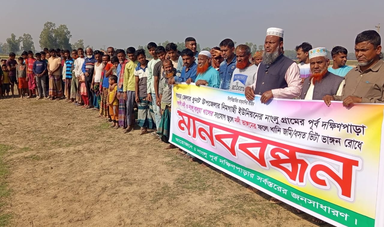 ধুনটে বাঙ্গালী নদী ও খালের ভাঙ্গনে বিলীন হচ্ছে ফসলি জমি মানববন্ধনে ভাঙ্গনরোধে জরুরি পদক্ষেপের দাবি